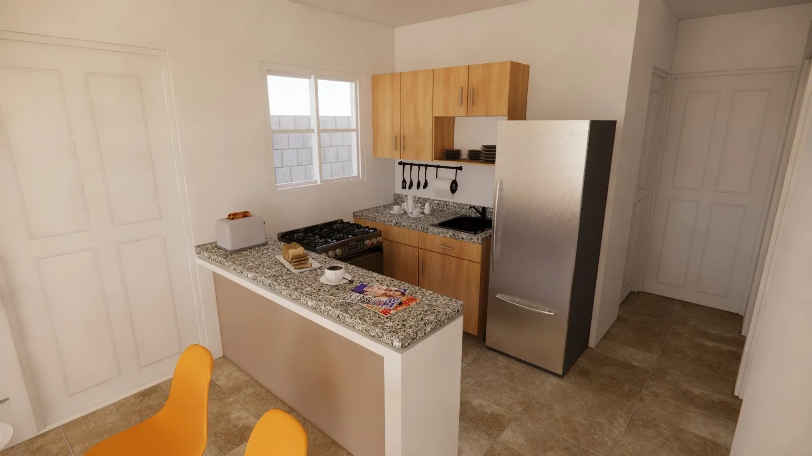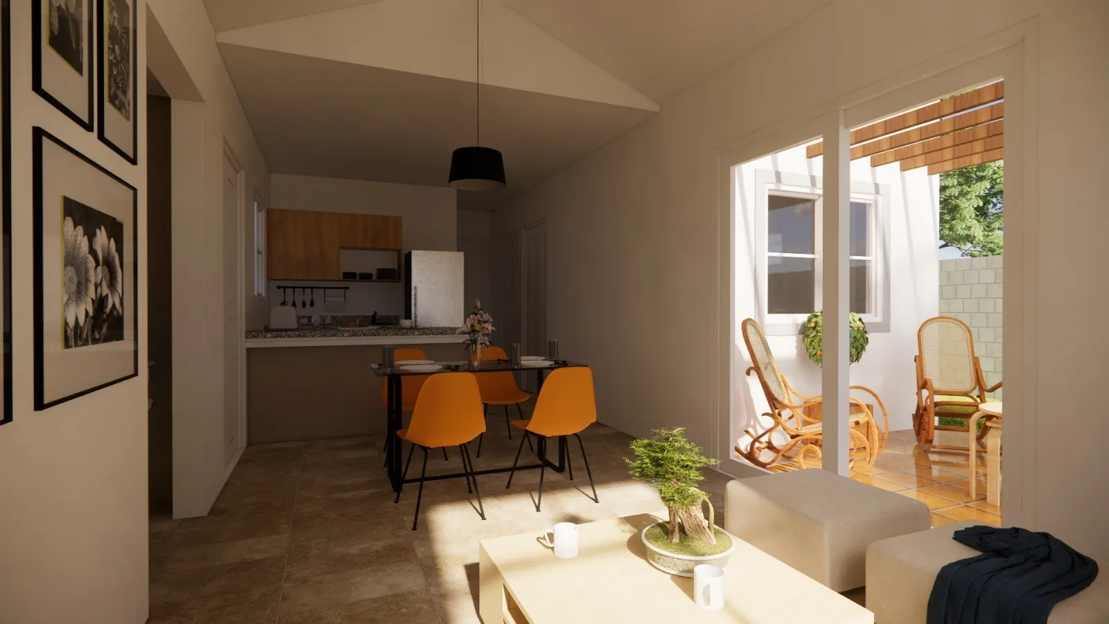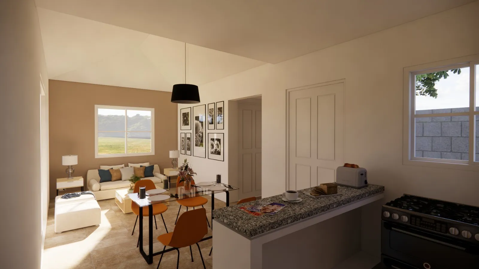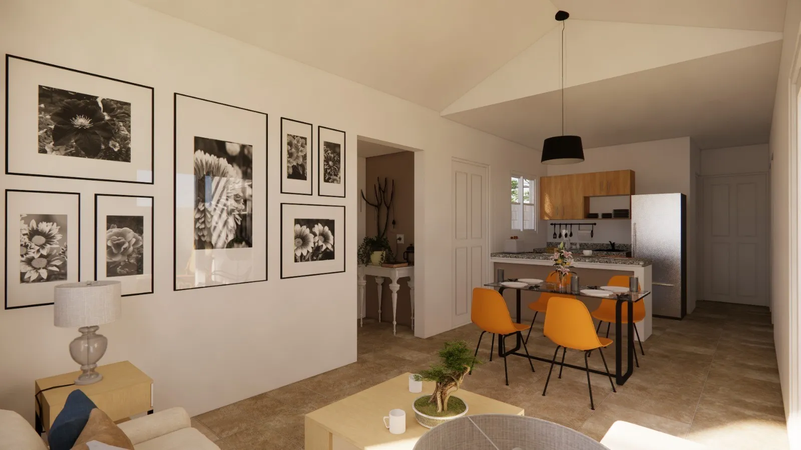La distribución interior prioriza la conexión natural entre los espacios sociales. Sala, comedor y cocina se integran en una planta abierta que favorece la convivencia diaria y la entrada de luz natural. La vivienda cuenta con tres dormitorios, un baño y una terraza, pensados para brindar comodidad y funcionalidad en la vida cotidiana.