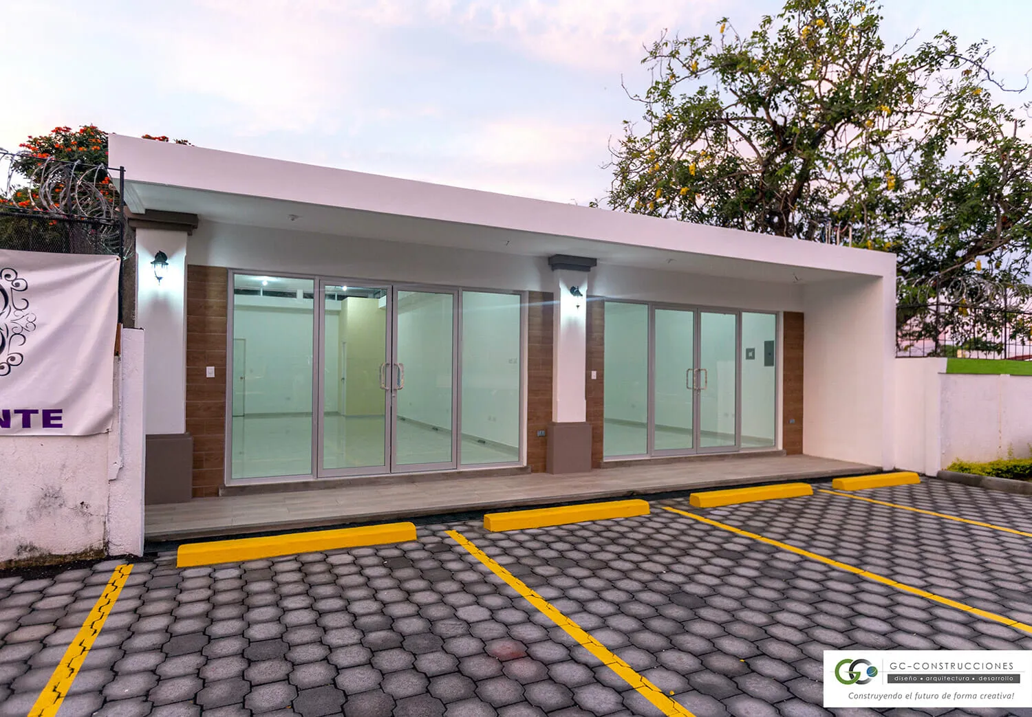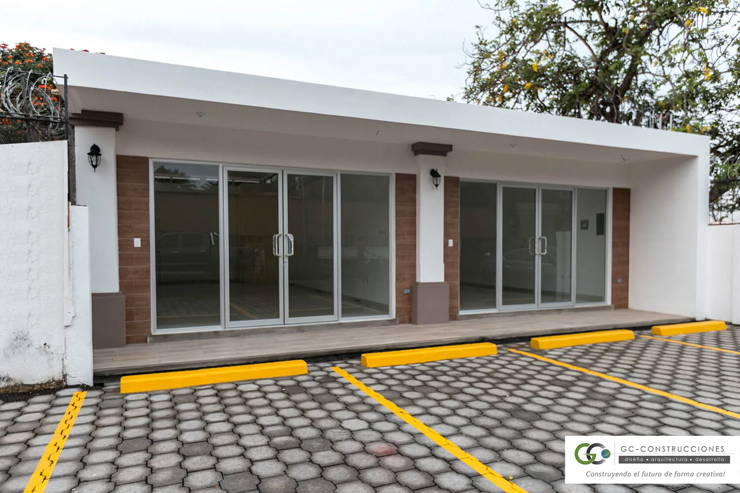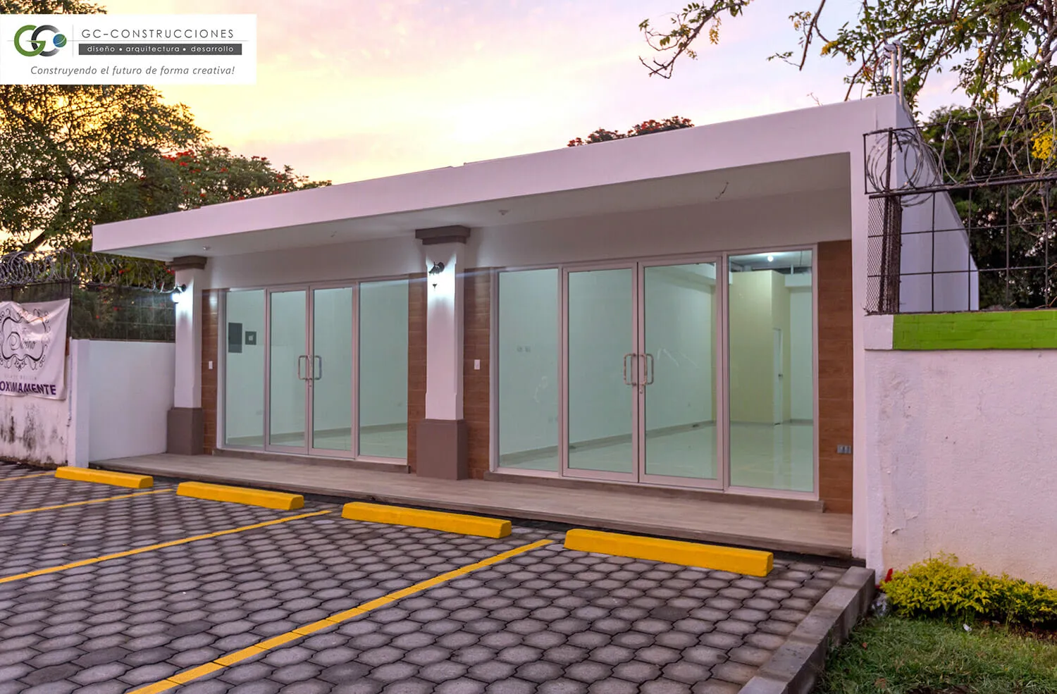 Primera etapa de la Plaza Comercial MS, ubicada en Las Colinas, Managua. Un diseño moderno y funcional de 120.5 m² que optimiza el espacio comercial y ofrece una estética atractiva.